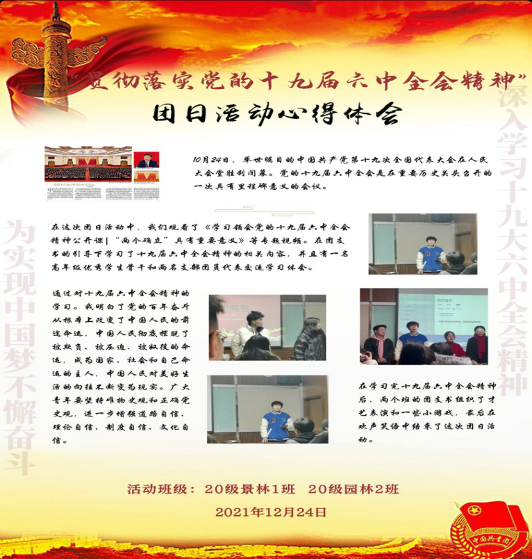 2021级风景园林7、8班在12月25日31教202内通过提前准备小吃食,有奖激励回答,高年级优秀员工骨干分享学习心得,团员交流,制作PPT和精美海报等形式明白了作为中国共产党的第三个历史决议,其集中了全党的智慧,是一篇马克思主义的纲领性文献,是新时代中国共产党人牢记初心使命,坚持和发展中国特色社会主义的政治宣言,是以史为鉴、开创未来,实现中华民族伟大复兴的行动指南。自中国共产党成立以来,就始终把为中国人民谋幸福、为中华民族谋复兴作为自己的初心使命,始终坚持社会主义信念和共产主义理想。