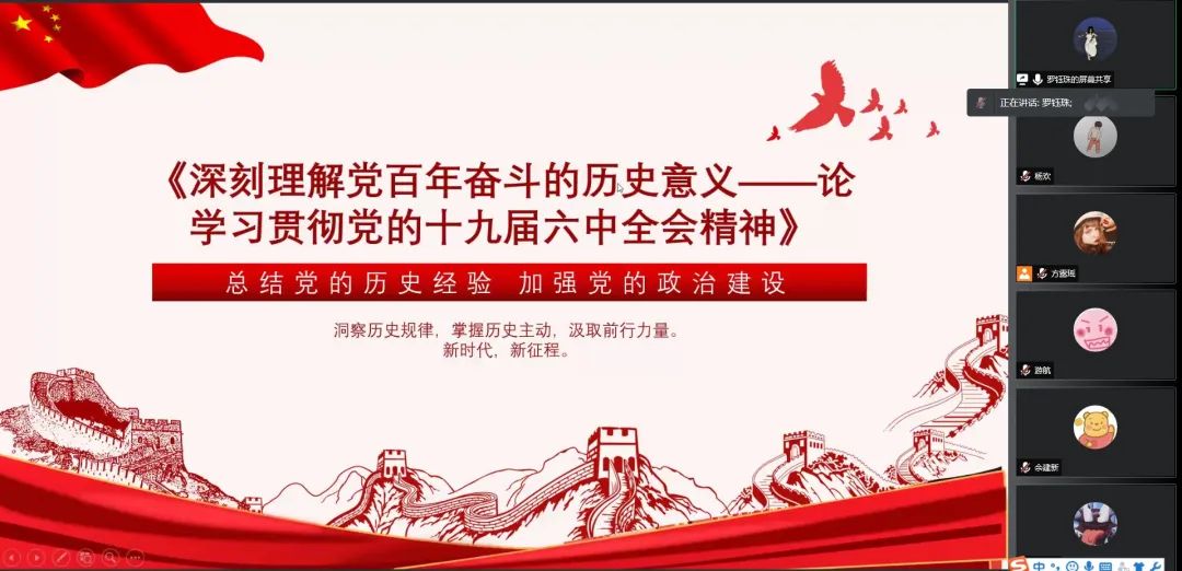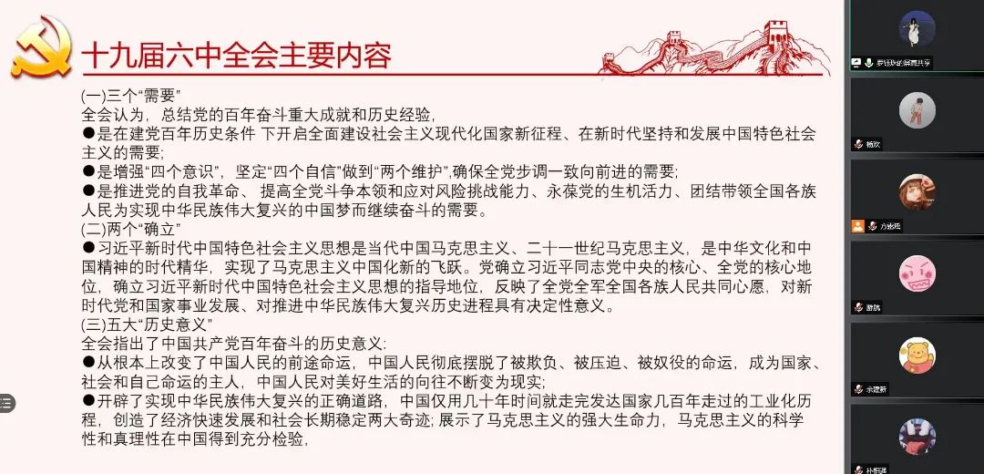 会议议程第二项为回顾历届六中全会,此次会议回顾了自1981年6月27日至29日召开的十一届六中全会一直到2011年10月15日至18日召开的十七届六中全会。在讲解员的解说下公司团委员工会全体人员认真聆听历届六中全会主要议题,深入学习其背后的精神。会议议程第三项为观看相关视频并邀请员工代表发言,会议中全体人员观看了十九届六中全会的相关解说视频,并邀请公司团委员工会工作人员陈煜琳、安林灵两位同学就观看视频“十一届六中全会召开历史意义”发表自己的感想,他们提到在此次线上会议的学习加上视频的讲解,深刻体会到十九届六中全会在中国发展史中的重要意义,对会议精神也有了自己更加深刻的理解。