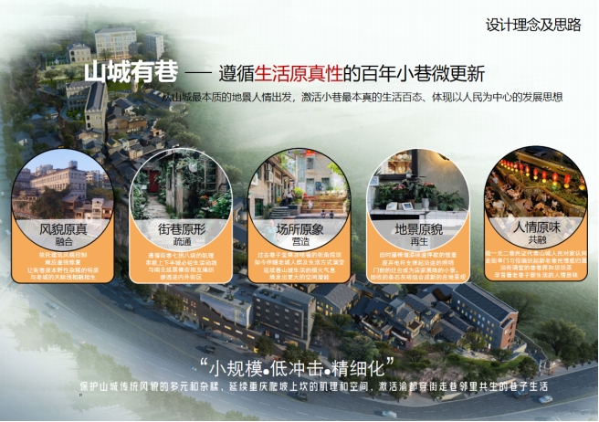 《山城巷传统风貌区景观设计》项目以“山城有巷——遵循生活原真性的城市微更新”为规划设计理念,深度挖掘巷子历史痕迹,沿袭山城市井生活文脉,定位“烟火山 ·巷往生活” 的整体思路,遵循“小规模·低冲击 ·精细化”的更新策略,保护山城传统风貌的多元和杂糅,延续重庆爬坡上坎的肌理和空间,激活渝都穿街走巷邻里共生的巷子生活,梳理出“风貌原真的融合、街巷原形的疏通、场所原象的营造、地景原貌的再生、人情原味的共融”五大价值体系,意从山城最本质的地景人情出发,激活小巷最本真的生活百态,体现以人民为中心的城市更新思想。项目建成后获得居民与游客的一致好评,主管部门和专家同行的充分认可,新闻媒体予以广泛报道。