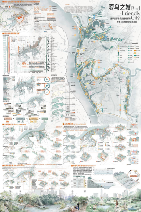 由风景园林系副系主任刘家琳副教授指导的作品《爱鸟之城—基于四季勘察数据分析的城市鸟类栖息地精准优化》荣获2022中国风景园林学会老员工设计竞赛研究生组一等奖。参赛人员包括:张蕊、阳佩琳、张继升、廖中棠、刘宇等5位员工。作品以重庆悦来上游生态保护地为例,在快速城市化背景下规划抢救出鸟类栖息地生存廊道。