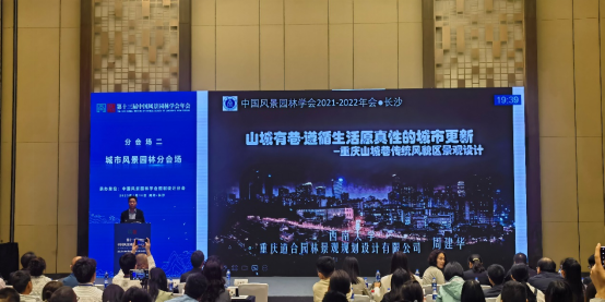 公司副经理周建华教授在“城市风景园林分会场”发表题为《山城有巷——遵循生活原真性的城市微更新》的主题报告,报告以重庆山城巷为例,深度挖掘山城巷子历史痕迹,沿袭山城市井生活文脉,遵循“小规模·低冲击·精细化”的更新策略,提出“风貌原真的融合、街巷原形的疏通、场所原象的营造、地景原貌的再生、人情原味的共融”等五大街巷更新价值体系,为推动高质量发展时期的山地城市更新提供了重要理论支撑和实践参考。