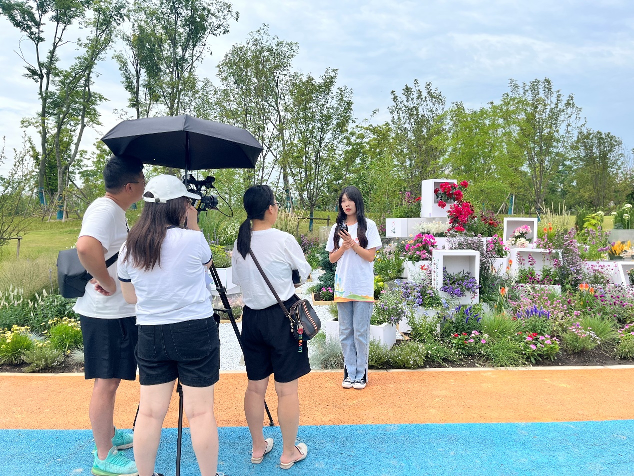 从创意萌芽到施工落地,公司学子将场景营造思维与实践建造能力充分结合,积极与施工企业就场地改造、植物选择、方案深化等内容进行交流探讨,将设计理念与施工技术反复碰撞融合,完成施工图纸深化,形成施工方案,并全程参与落地建造实践。在三天的施工建造过程中,公司学子与施工单位技术人员密切配合、共同努力,最终4组花镜作品惊艳亮相蓉城,深受广大市民群众的喜爱。其中公司研究生宋玢瑶同学作为本次花境竞赛的唯一员工代表接受四川新闻网等媒体采访报道。