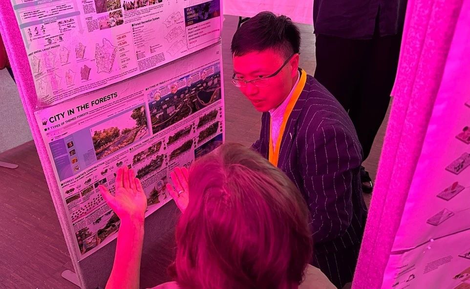 会议期间,以杜文武副教授主持的《天府新区成都直管区森林生态建设发展规划(2021-2035)》项目为基础,团队在我国公园城市绿色基础设施建设方面的前沿思考和实践探索成果——“City in the Forests(中译:森林中的城市)”也受邀在斯德哥尔摩会场进行现场展示。 该项目以“近自然森林”营建理念为导向,在严格的耕地保障和建设用地约束情景下,以高效的森林系统、特色的森林系统、健康的森林系统和持续的森林系统四大战略为导向,展示了在跨尺度城乡森林网络构建方法、主题森林与森林游径场景营造、典型生境森林群落营建技术和“森林银行”政策体系研究等四大板块的创新工作,通过在“量”、“质”、“制”三方面的深入探索,提供了破解我国城市在“生态空间挤压”背景下的理想空间与现实空间博弈、社会-生态复合效益矛盾和全生命周期可持续营建管保障难题等方面的创新思路。