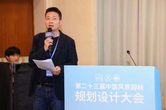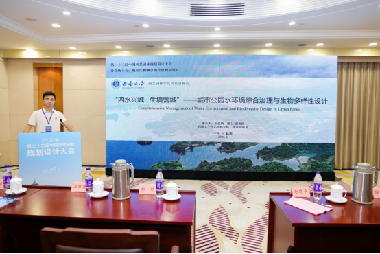 辛儒鸿在分论坛十五:城市生物栖息地营建规划设计,发表题为《“四水兴城,生境营城”——城市公园水环境综合治理与生物多样性设计》的主题报告。报告系统论述了城市水环境治理的演变历程与发展趋势,以及发达国家、优秀城市的水环境治理经验与启示。聚焦“水-生资源如何融通、水-城环境如何联动、城-景价值如何激活”三大关键问题,提出“两尊重、三协同、四维一体”的城市水环境综合治理与生物多样性设计理论框架。最后结合重庆市大足开区水环境综合治理项目,阐释了通过“立水、优水、悦水、兴水”四大实施路径,打造“产、城、境、业”一体化发展的规划设计思路。