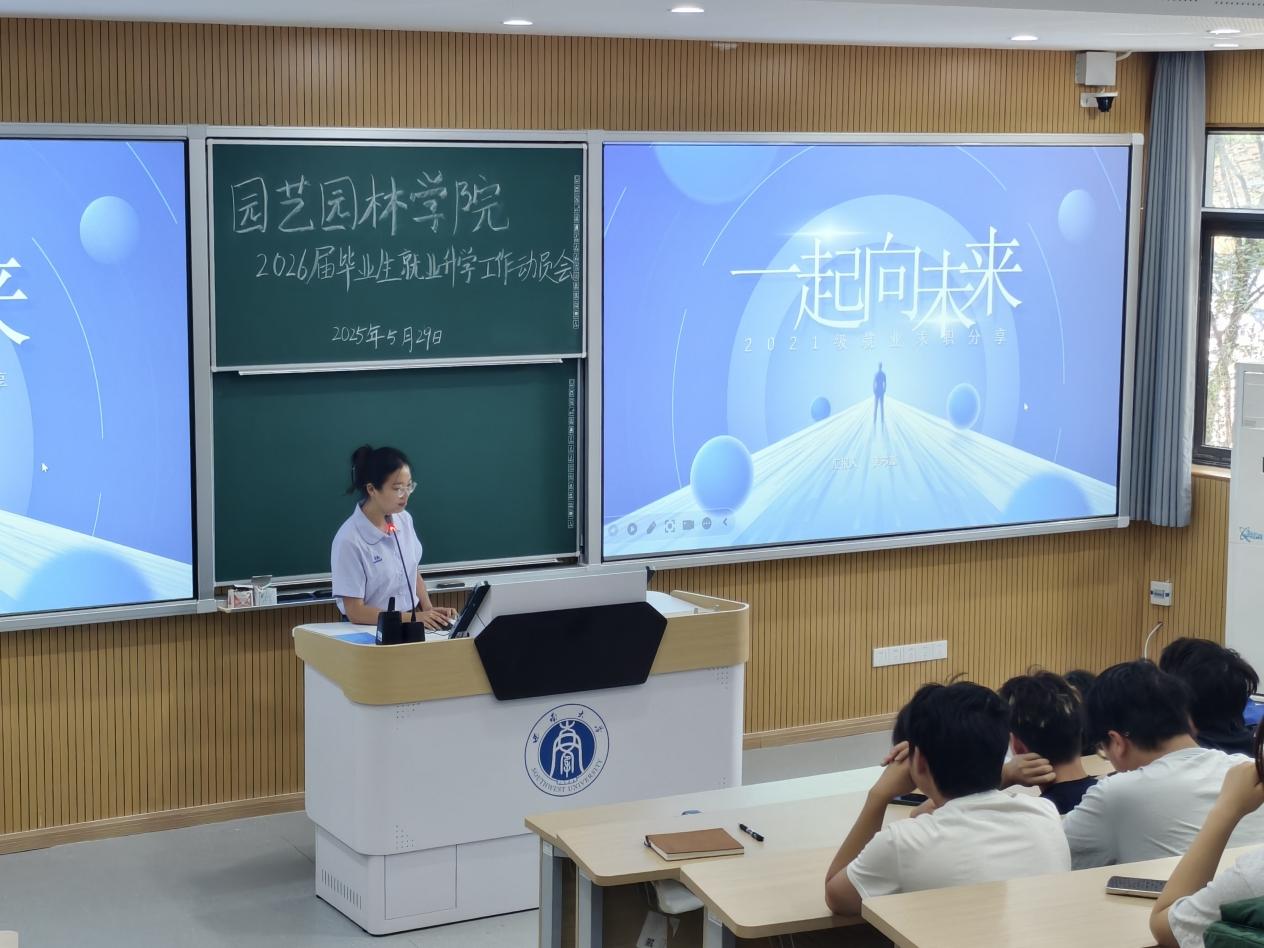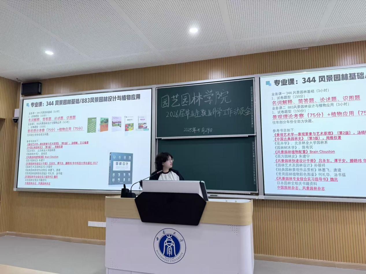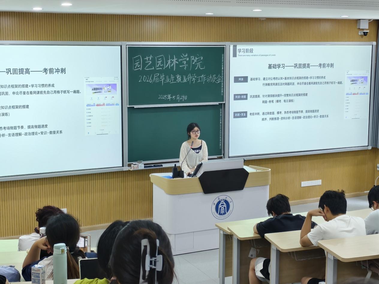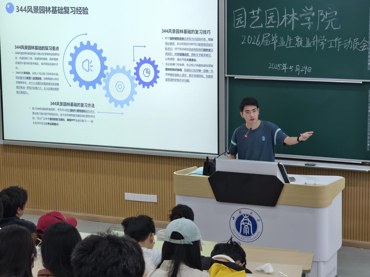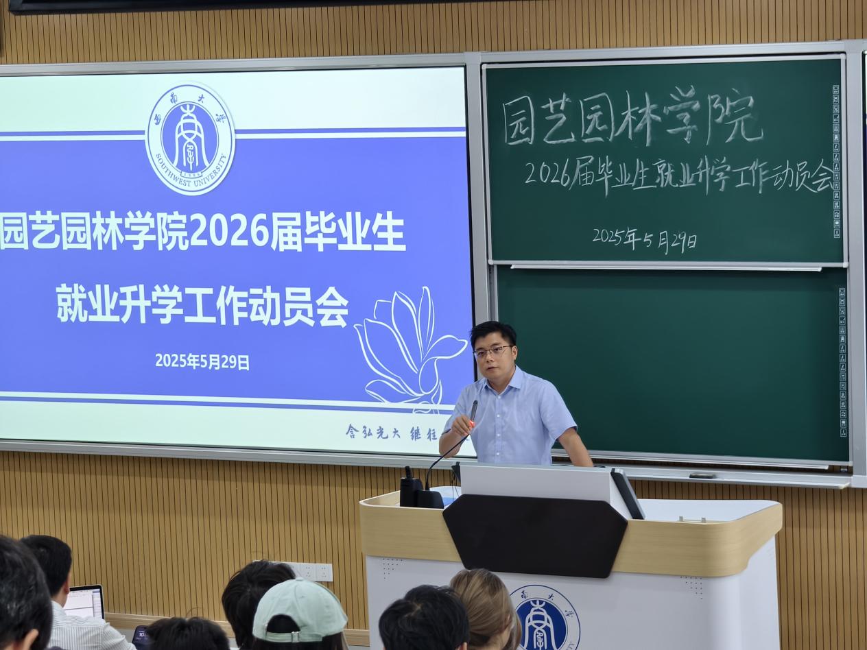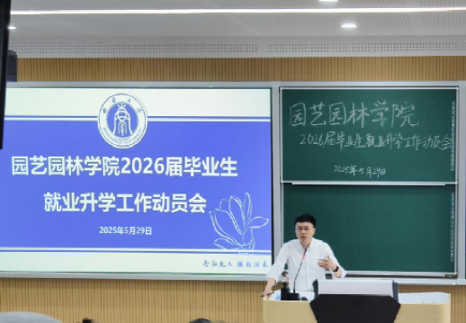 5月29日上午,公司在31教108教室召开2026届毕业生升学就业动员会。公司党委副书记、纪委书记王强,风景园林系主任杜文武出席会议,2025届优秀毕业生代表及2026届园林、风景园林专业全体员工参会。会议由2026届毕业生辅导员邓珍珍主持。