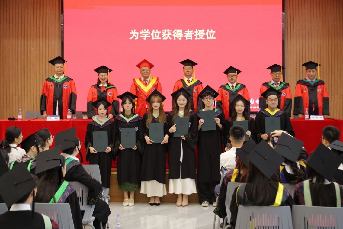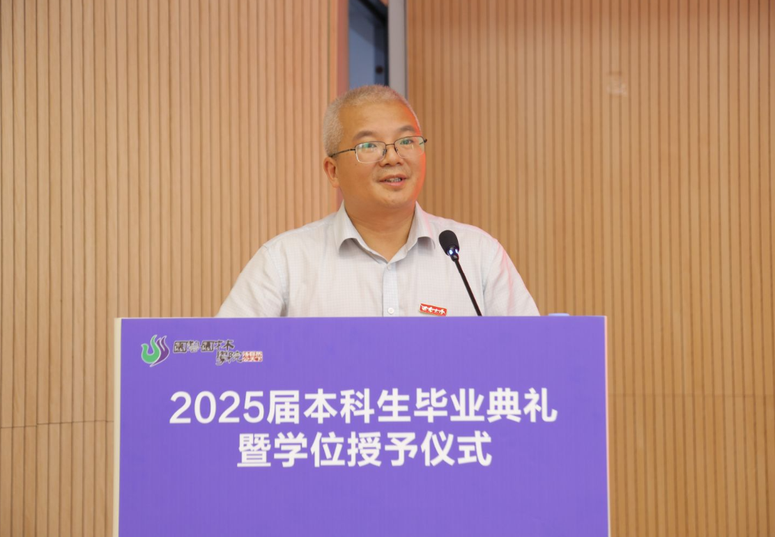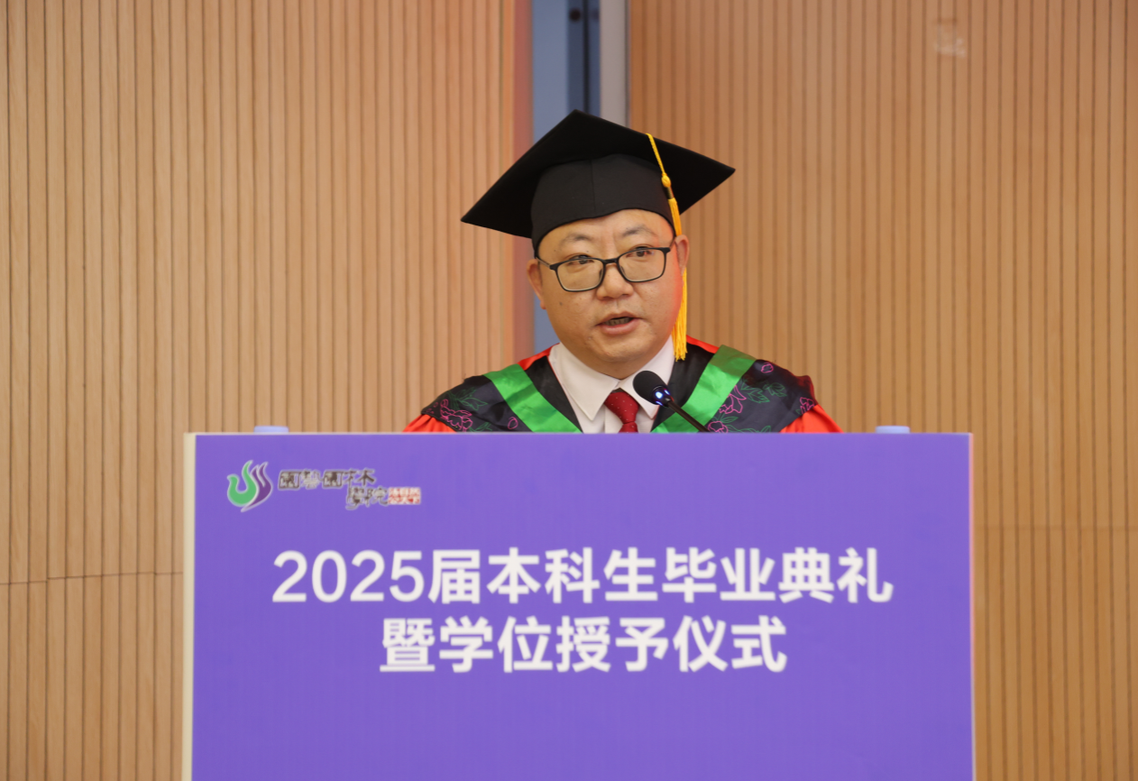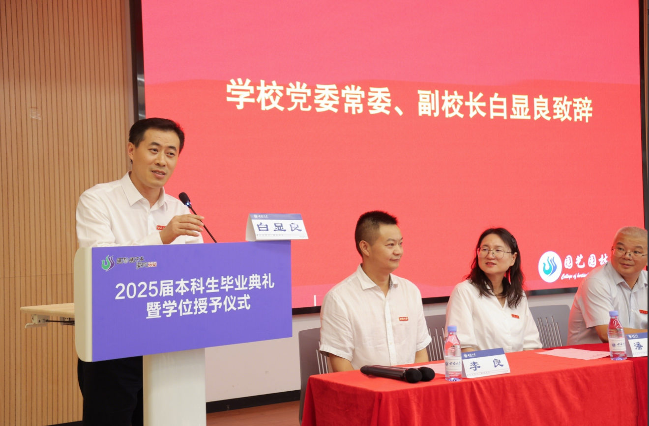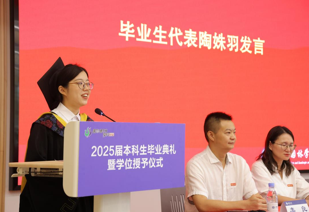 毕业生代表、2025届风景园林专业陶姝羽代表全体毕业生发言。她分享了自己扎根成长的老员工活,向母校、老师和同学表达感谢,向袁隆平院士、吴明珠院士等优秀员工们表达了崇高的敬意。她以“变革中的坚守”的感悟,呼吁每一位毕业生像种子般静待破土,像根系般向下深扎,像年轮般向内生长。在四季轮转中等待花开,在时光流转中守候答案。在变革的时代里,始终怀揣梦想,勇敢前行。教师代表辛儒鸿副教授则希望广大青年学子胸怀家国,永葆对初心的热爱和坚守;知行合一,永葆对事业的热爱和坚守;无惧风雨,永葆对生活的热爱和坚守。