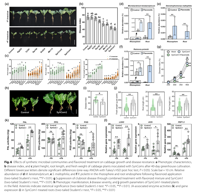 (4)人工合成菌群与黄酮的协同抑病作用:构建包含上述优势菌的合成菌群(SynCom1)后,单独施用可在温室条件下使病害抑制提升34%。当与两种黄酮联用时,抑病效果进一步增强,且根部定殖效率显著提高。此外,该组合可部分激活甘蓝中茉莉酸(JA)依赖的防御通路,但核心抑病效应仍主要依赖于黄酮驱动的微生物定殖,而非直接诱导植物免疫。