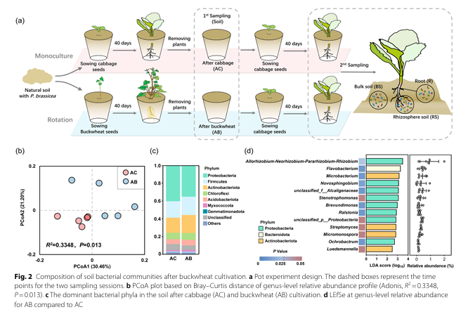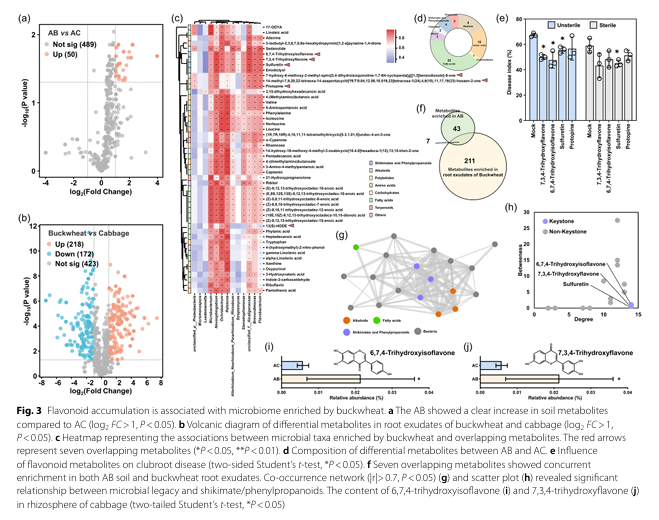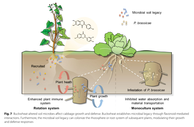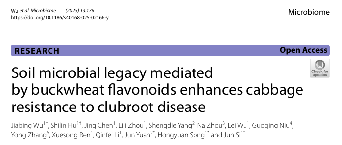 近日,公司司军教授、宋洪元研究员联合南京农业大学袁军教授团队在国际微生物组权威期刊Microbiome发表了题为Soil microbial legacy mediated by buckwheat flavonoids enhances cabbage resistance to clubroot disease的研究论文。该研究系统阐明了荞麦通过分泌特定黄酮类物质,重塑土壤微生物群落,并增强后茬甘蓝对根肿病抗性的机制,为构建精准化的绿色轮作模式提供了理论依据和实践路径。
