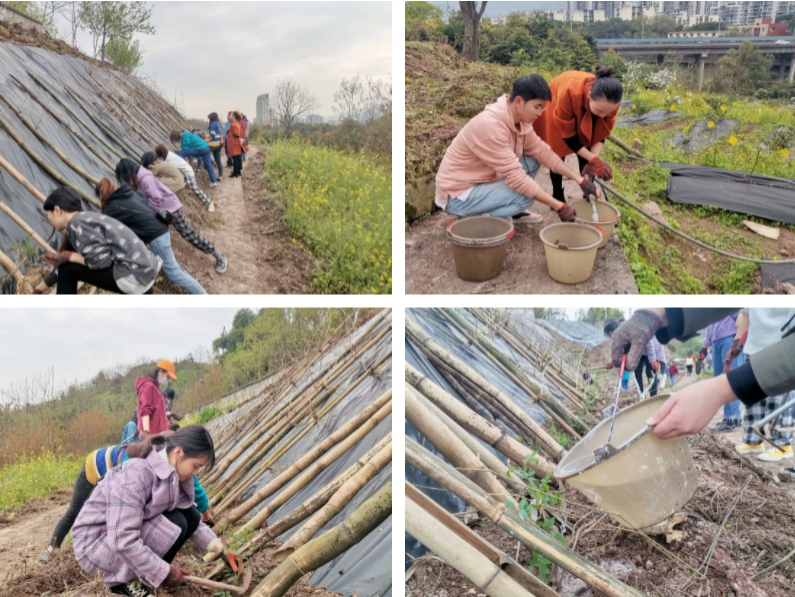 活动现场,党员同志们劳动热情高涨,在钱春老师的指导下分工明确:定点挖坑、取苗运苗、放苗回填、浇水灌溉。种植过程中众人团结协作,配合默契,共同播洒生命的绿色。