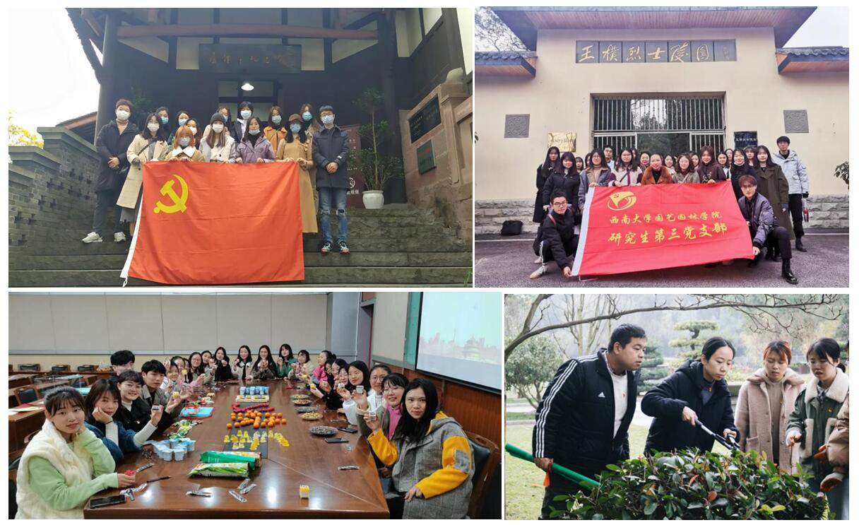 此外,越来越多的支部创新主题党日活动形式,组织开展相关特色活动。研究生第四党支部于2020年12月4日前往卢作孚纪念馆,探访先贤足迹;研究生第六党支部给支部党员过了一个特殊而有意义的政治生日,有力地增进了支部的凝聚力和战斗力;研究生第三党支部组织外出参观王朴烈陵园,缅怀革命先烈的丰功伟绩,增强了支部党员的政治责任感和历史使命感;本科生园林和园艺党支部将“五个一”开展和主题党日结合,组织支部成员共青团花园修枝剪枝的活动,充分展现专业特色。