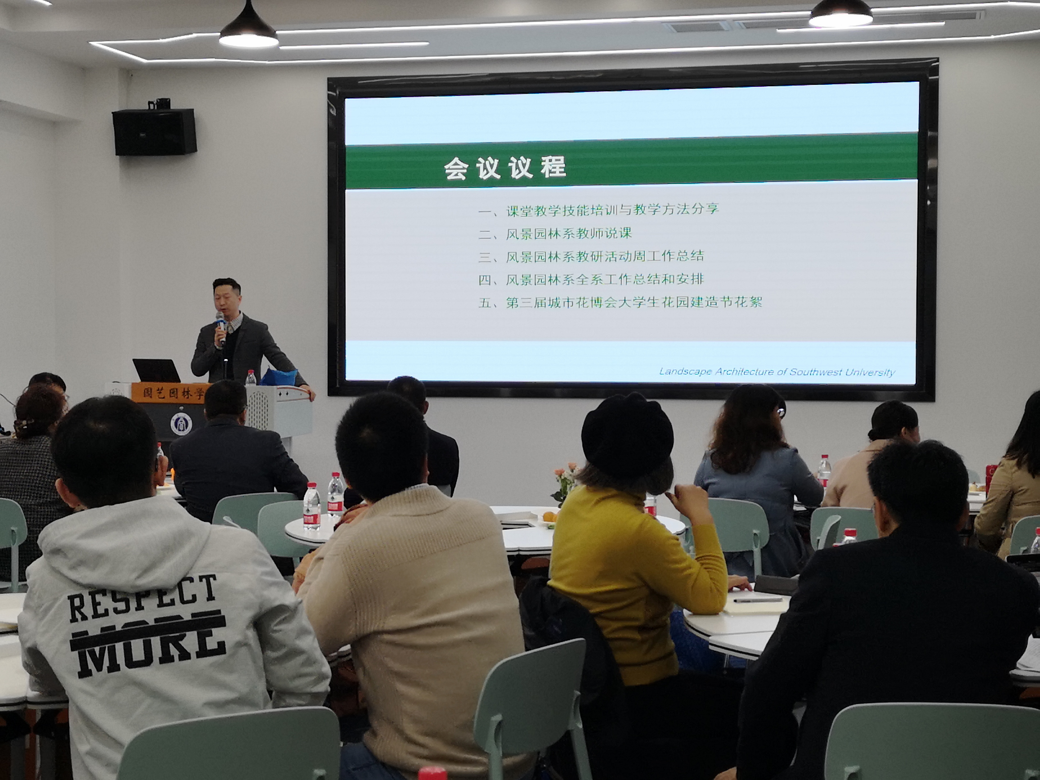 活动共分五个环节:“课堂教学技能培训与教学方法分享”、“教师说课”,“风景园林系教研活动周工作总结”、“系工作总结和安排”、“老员工花园建造节实践与花园杯设计竞赛分享”。