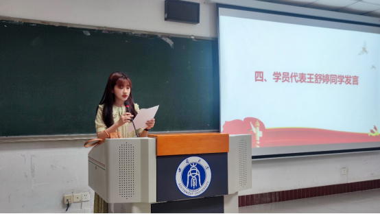 党校学员代表王舒婷同学作发言。她表示在党校学习中会严守纪律,认真做好笔记,不断学习党的理论知识并将其运用于实践中,不断提高自己的思想觉悟,以实际行动来接受党组织考验,争取早日入党。