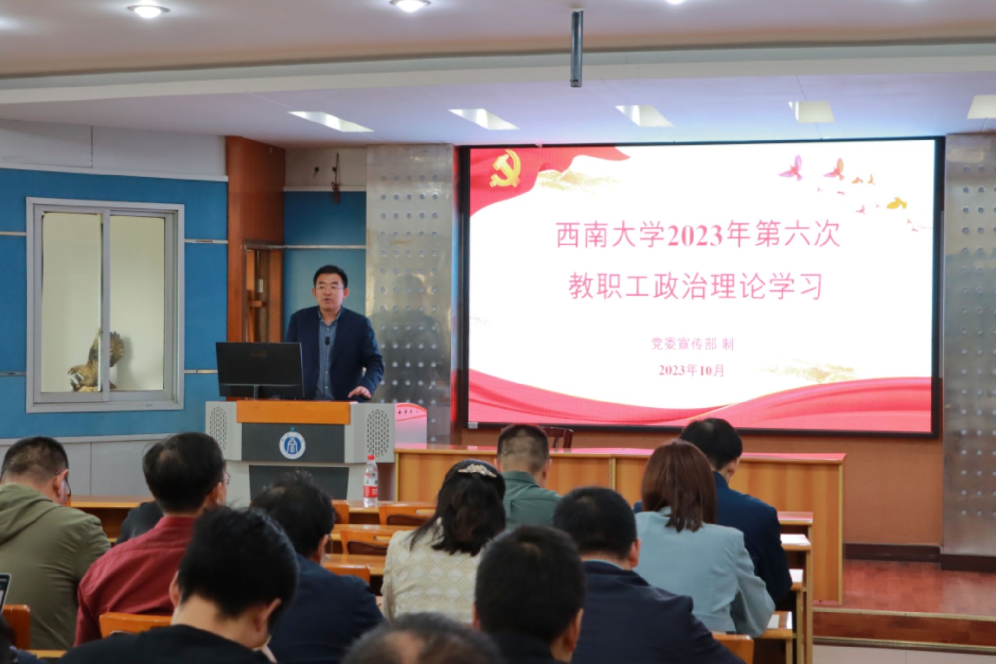 潘玉锋带领大家学习了习近平总书记关于意识形态工作的重要论述。他强调,意识形态工作一定要把围绕中心、服务大局作为基本职责。高校是意识形态工作的前沿阵地,每位老师应该做到守土有责、守土负责、守土尽责。
