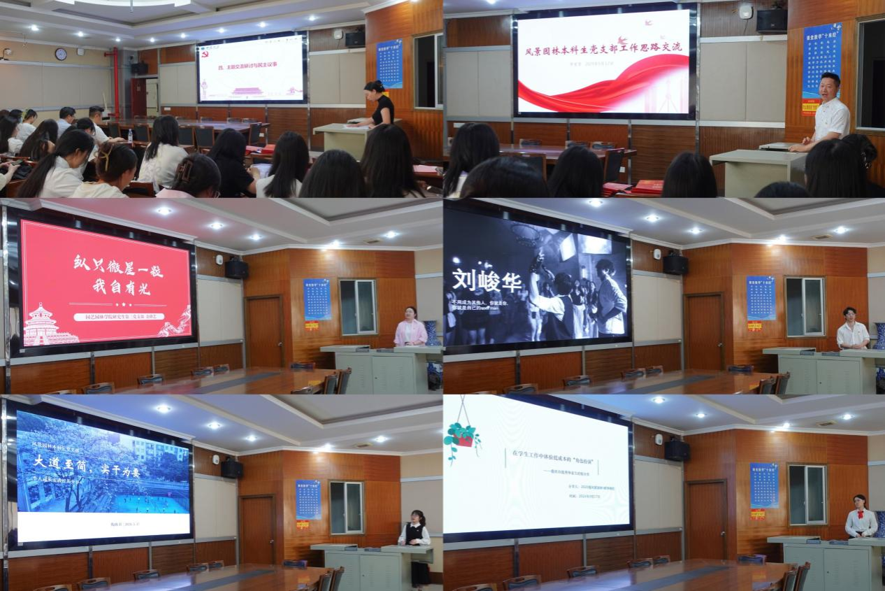 在主题交流研讨与民主议事环节,研究生第三党支部书记张靖悦、风景园林本科生党支部书记罗爱军围绕“党支部的使命愿景是什么”和“员工党支部如何为培养一流人才发挥战斗堡垒作用”作主题发言。2024届重庆市普通高校员工先进个人余隆艺、刘峻华、陶姝羽和毕铭桧就“员工党员如何争做有理想、敢担当、能吃苦、肯奋斗的新时代好青年”作了主题分享。