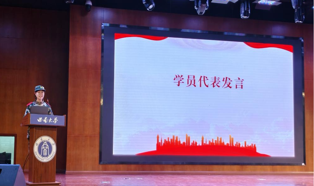 承训部队教官罗森对公司2024级本科生顺利完成军训课程表示祝贺,对新生在军训中表现出的坚韧不拔、勇于挑战自我的精神给予了高度评价,希望同学们将军训中培养的优秀习惯、良好作风带入今后的学习生活中,树立报效祖国的远大理想。随后,2024级本科生学员代表邬静发言,她代表全体参训学员对公司领导老师在军训期间的关怀表示衷心感谢,对教官们的耐心教导表达崇高敬意,并表示未来将永葆坚强意志,加强品德修养,刻苦钻研学习,将军训培养的良好作息和习惯保持下去,养成积极向上的生活态度和健康的生活方式,努力成为德智体美劳全面发展的时代新人,为社会贡献力量,为祖国的发展添砖加瓦。
