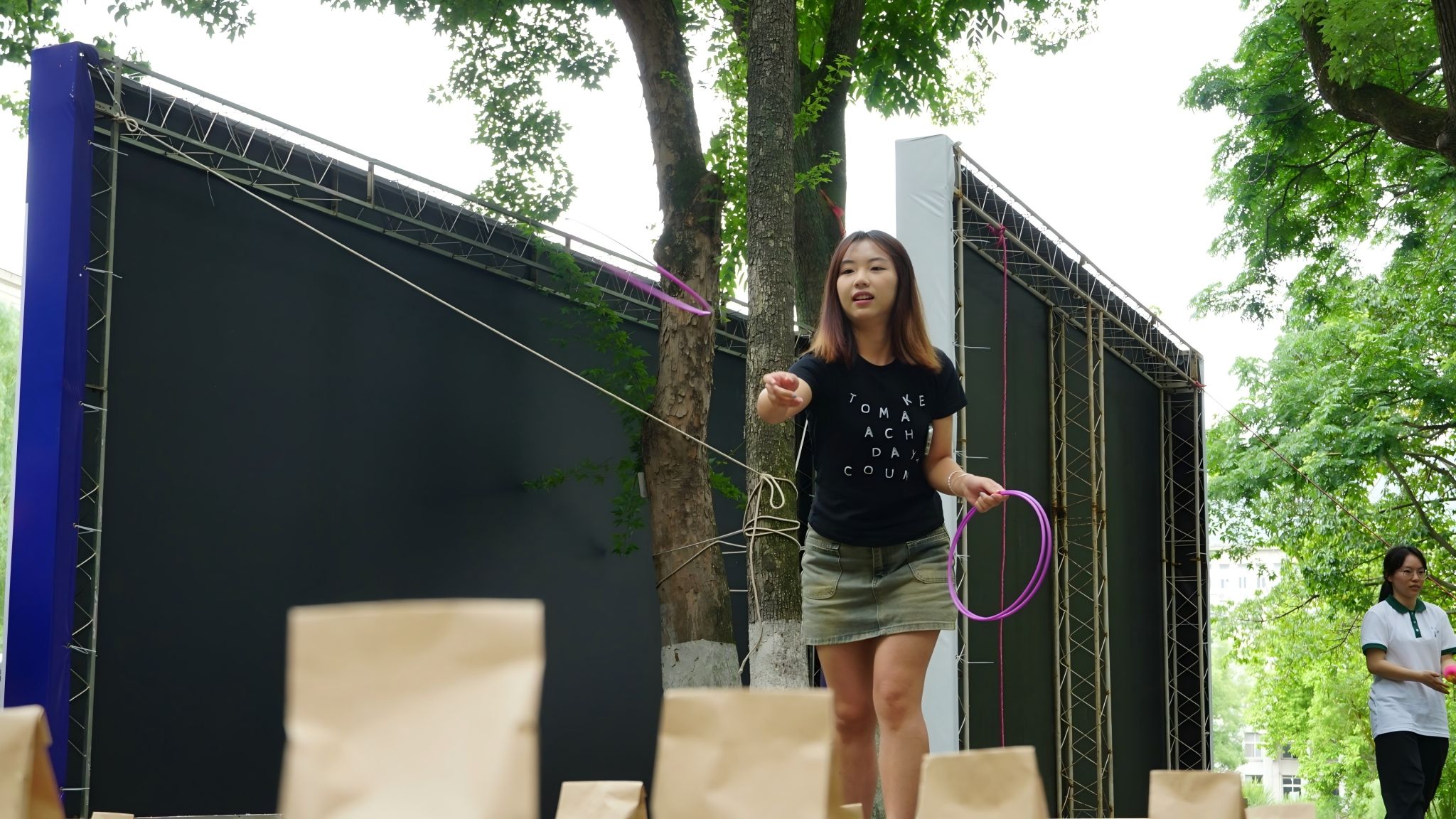 “晕头蝇向”的游戏让现场气氛高涨。参与者旋转后虽脚步略显踉跄,但仍眼神坚定地瞄准目标桶,努力投掷弹力球。成功投中的欢呼与失败后的加油声此起彼伏,大家在趣味挑战中释放活力,感受花卉果蔬的魅力。