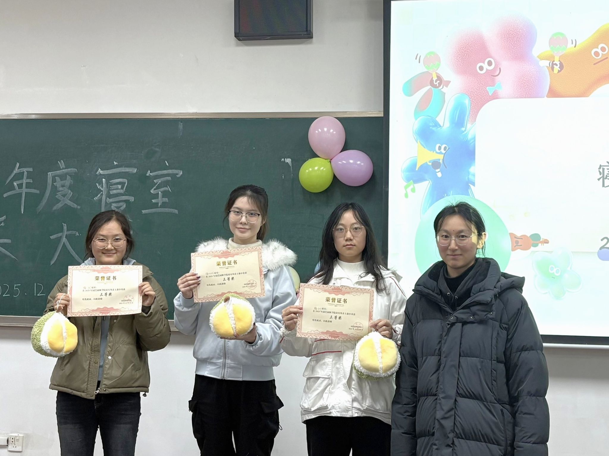 经过展示评比打分,楠园九舍407宿舍荣获一等奖;楠园一舍523宿舍、楠园一舍516宿舍荣获二等奖;楠园一舍705宿舍、楠园一舍503宿舍、楠园一舍415宿舍荣获三等奖;楠园一舍530宿舍荣获志愿服务奖;楠园一舍709宿舍荣获团结互助奖;楠园一舍521宿舍荣获文体风采奖;楠园一舍703宿舍荣获学习创新奖。