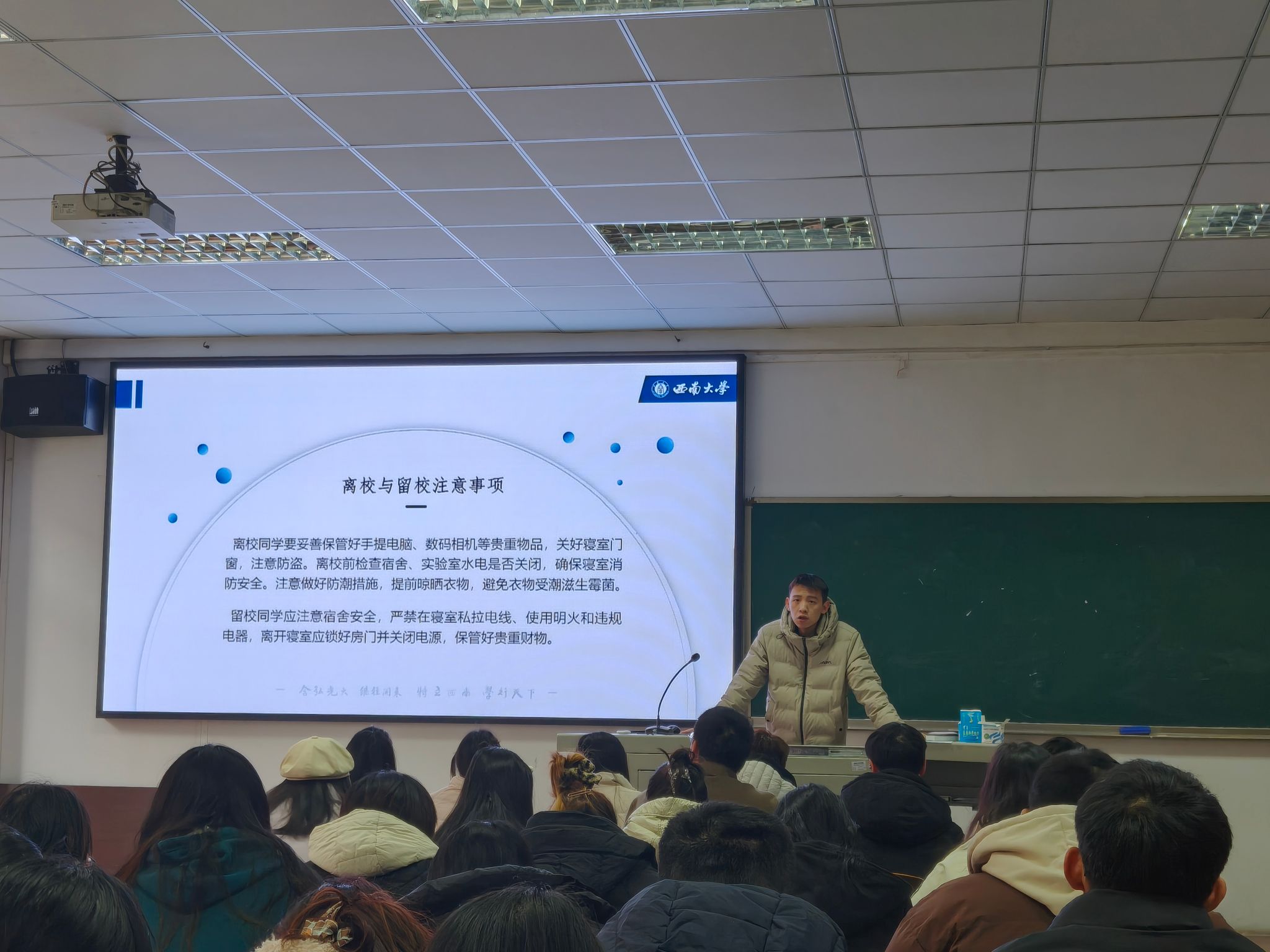 徐耀庭针对离校与留校两类员工分别作出安全提示,要求全体研究生提高安全防范意识,严格遵守校园管理规定,切实保障假期人身与财产安全,同时明确了假期留校纪律与安全要求。