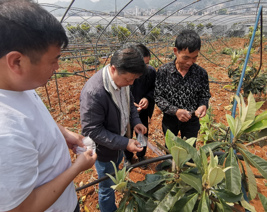 梁国鲁研究员(左二)指导蒙自市枇杷嫁接工作