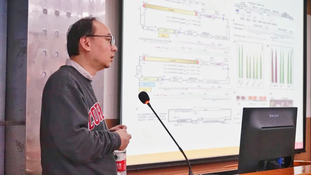 随后,祝教授以TGSⅡ系统的应用为切入点,强调了microhomology-mediated end joining(MMEJ)方法对依赖CRISPR/Cas9为基础的植物基因组片段高效删除的重要性,并向我们展示了所在实验室的最新研究成果。最后,祝教授介绍了植物色素的类型和应用,他指出用PhieCBEs胞嘧啶单碱基编辑器对植物色素进行人工干预后生产的“赤金米”的淀粉含量与普通大米相差无几,更有益于人们的健康。讲座中,祝教授旁征博引,使大家在分子层面对基因工程的研究有了更全面的认识,受到了在场师生的热烈欢迎。