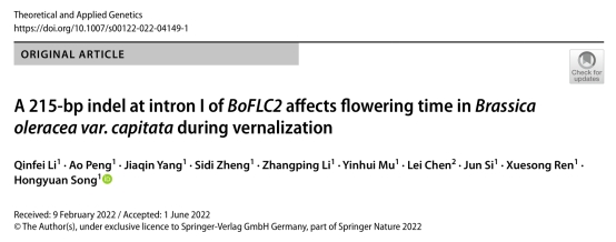 近日,bevitor伟德宋洪元团队在植物遗传育种领域国际知名杂志《Theoretical and Applied Genetics》在线发表了题为《A 215-bp indel at intron I of BoFLC2 affects flowering time in Brassica oleracea var. capitata during vernalization》研究文章,该项研究不仅提供了一种有效的耐抽薹分子标记辅助选择策略来鉴定结球甘蓝资源和促进新品种选育,也为探索绿体春化植物开花机制提供了切入点。