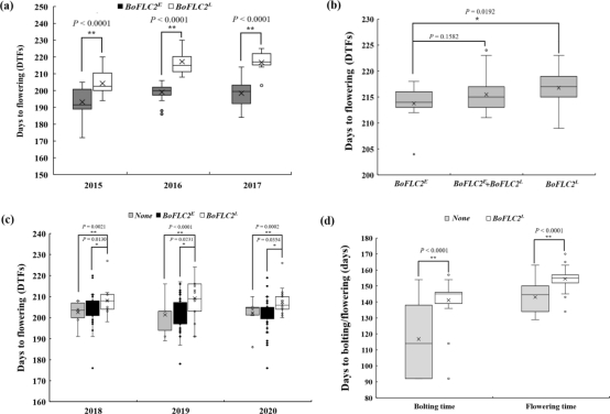 BoFLC2是结球甘蓝响应低温春化过程中非常重要的转录因子之一。尽管青花菜中有报道BoFLC2的遗传变异与花球形成早晚有关,然而BoFLC2基因遗传变异是否影响结球甘蓝开花期早晚尚不明确。该研究在极端早开花/晚开花结球甘蓝中克隆了BoFLC2E(早花)和BoFLC2L(晚花)基因,发现二者在内含子I存在215bp插入/缺失,外显子II有3个非同义SNP和3 bp插入缺失。以内含子I 215bp的indel-FLC2标记,在40个极端早/晚开花结球甘蓝,103份自然结球甘蓝自交系,和2个F2群体中进行分子标记辅助选择,发现BoFLC2L与晚开花有关。