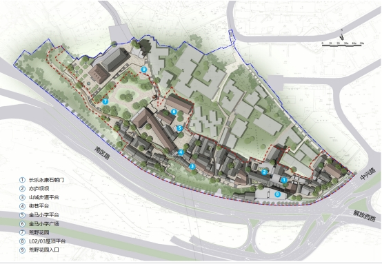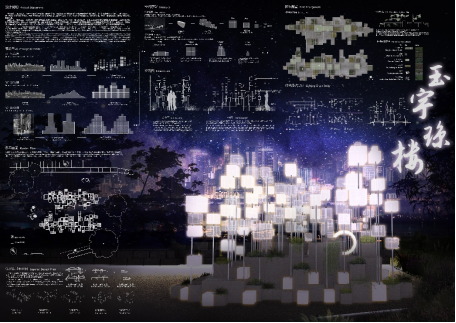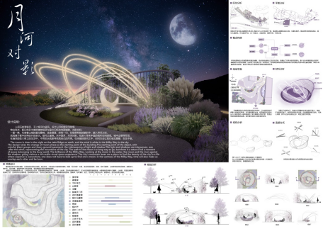 设计理念:人间玉岭清宵月,天上银河白昼风。设计以月相变化为构筑物出发点,配以色彩丰富的植物组团与星光闪烁的地面铺装,光影交织,一重一掩,代表着山城的重峦叠嶂。迷途漫漫,终有一归,在错落有致的编织中,踏入寻月之径,找到属于繁华世界的片刻安宁。银河之璀璨。水中望月,月河对影,给游人带来丰富的视听空间感受。城中山巷寻芳菲,在遍地都是六便士的生活中,不用抬头就能寻找到自己的月亮。在浩瀚的银河之中,时间也会让我们彼此重叠,生生不息。