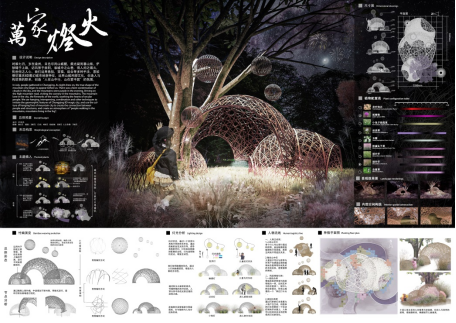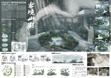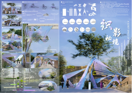 设计理念:对重庆的特色文化的思考是我们本次设计的缘起,围绕着城中山巷寻芳菲这一主题,我们对重庆的江水、桥梁、别具特色的街巷风貌进行解构重组,并最终设计出了以“江曲桥环· 山城魅影“为题的花园空间,以建造的方式来讲述山城故事,唤醒情感共鸣。花园空间的主体灵感来自于嘉陵江千厮门大桥,配景是一组高低错落的方格网架,勾勒出迷雾下的山城轮廓。通过灯光设计,勾勒独属于重庆的夜之绚烂;用风铃的悦耳声响,模拟江水涛涛之声;重庆独有的气候孕育多种灿漫的花卉植物,将花同构造相结合,呈现出别样的花卉之美。我们希望通过本设计,实现形与色的碰撞,声与影的结合,展现山城巷独特魅力,与观者共赴沉浸式文化体验之约。