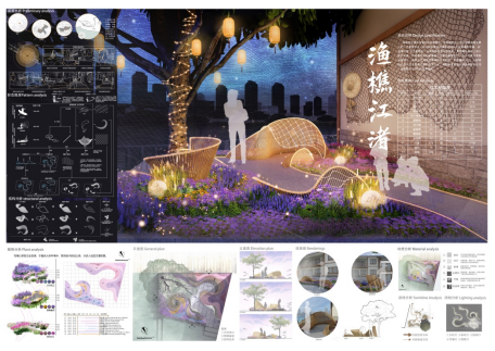 设计理念:《华阳国志·巴志》中“结舫水居五百余家”一言道出重庆深厚的码头文化,江滩樯桅如林、船蓬相连,处处可见渔民捕鱼之景。本设计以“渔樵江渚”为主题,以重庆码头文化为切入点,挖掘承载其深厚历史文化的要素“江水”、“渔网”、“船篙”,抽象三要素形态,通过构筑和植物营造“泛舟览江”、“银鳞雀跃”、“结网归舟”的场景序列,形成舒缓、跳跃、明快的节奏变化,艺术化展现老重庆码头捕鱼的生活场景,并结合夜晚灯光设计,营造“字水霄灯”的景象,带领观者浸入古老重庆江滩的浩浩江水,重忆往昔。