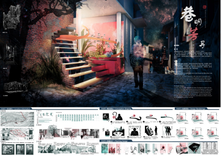 设计理念:山城巷位于重庆市渝中区,毗邻长江,其历史悠久。该场地名为长乐坊院,水平可操作空间10余平方米,属于四周封闭式院落。从重庆两江交汇处提取线形,进而推演出飘带作为设计元素。充分考虑场地整体基调,选择清雅、素净的绿色和白色作为植物搭配的主色调,再点缀青、白色的飘带营造出“苔痕上阶绿,草色入帘青”的意境美。再者,两个入口、两种材质的楼梯、两种类型的墙体成为场地的矛盾所在。基于此,引出时空碰撞的主题,再融入山城巷历史背景进而描绘了两个时空失意的旅人在长乐坊院相遇的故事,时空旅人绘卷由此展开......