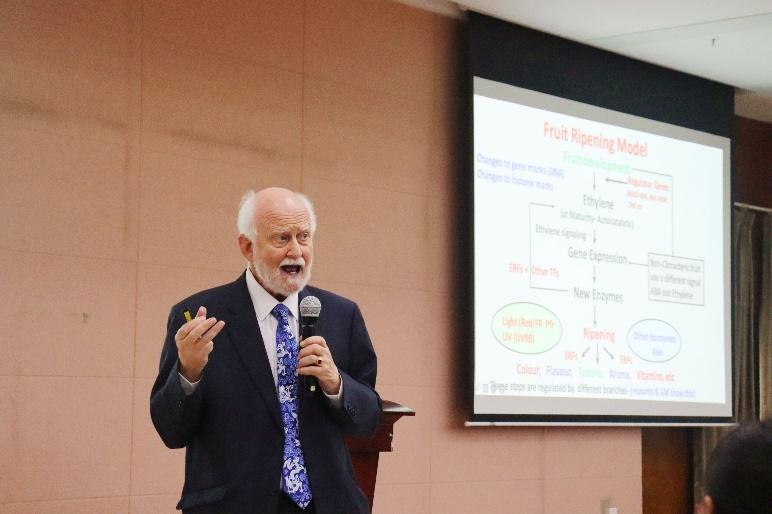 2023年10月8日下午,公司邀请英国皇家科公司院士、英国诺丁汉大学植物科学系名誉教授、中国工程院外籍院士、浙江大学光彪教授、国际知名果实品质生物学专家Dr.Don Grierson,于隆平楼204开展了以The Regulatory Networks Controlling Composition and Quality of Ripening Fruits为主题的学术报告,约200位师生参与本次讲座。